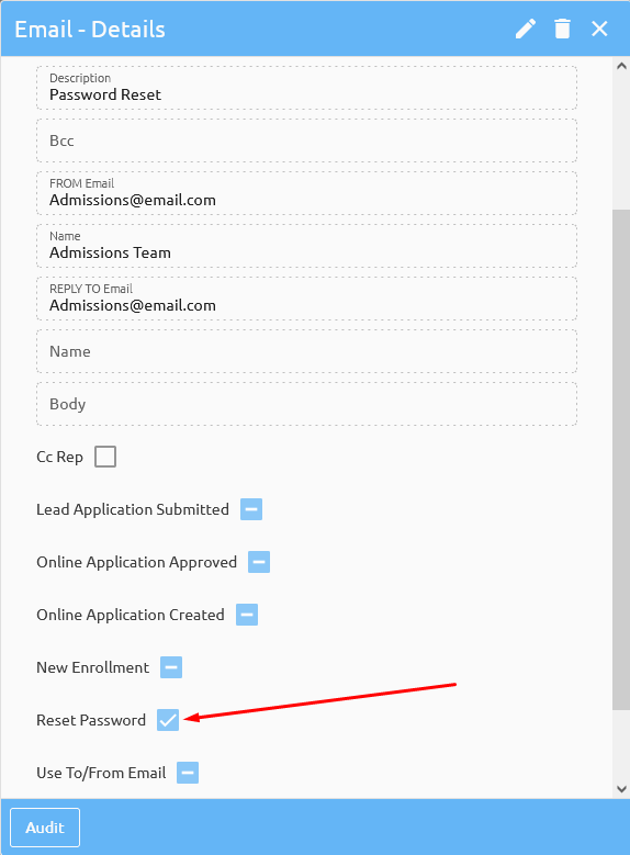 Once initiated, the system automatically generates a Reset Password email, configured under Admissions โ Setup โ Emails. Ensure the Reset Password checkbox is selected when setting up this email.