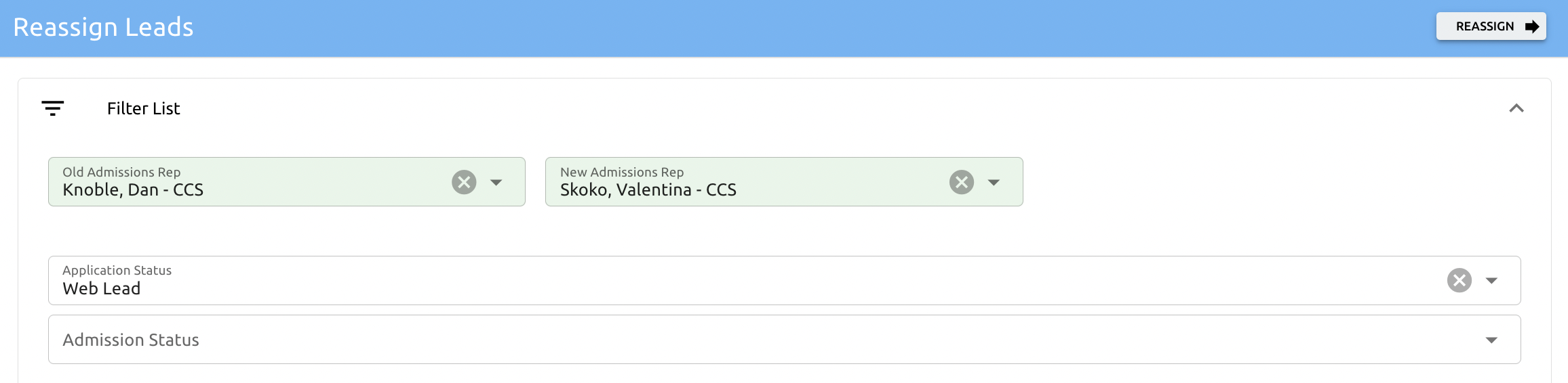 To reassign Admissions Representatives for students, go to Admissions โ Main โ Reassign Leads.