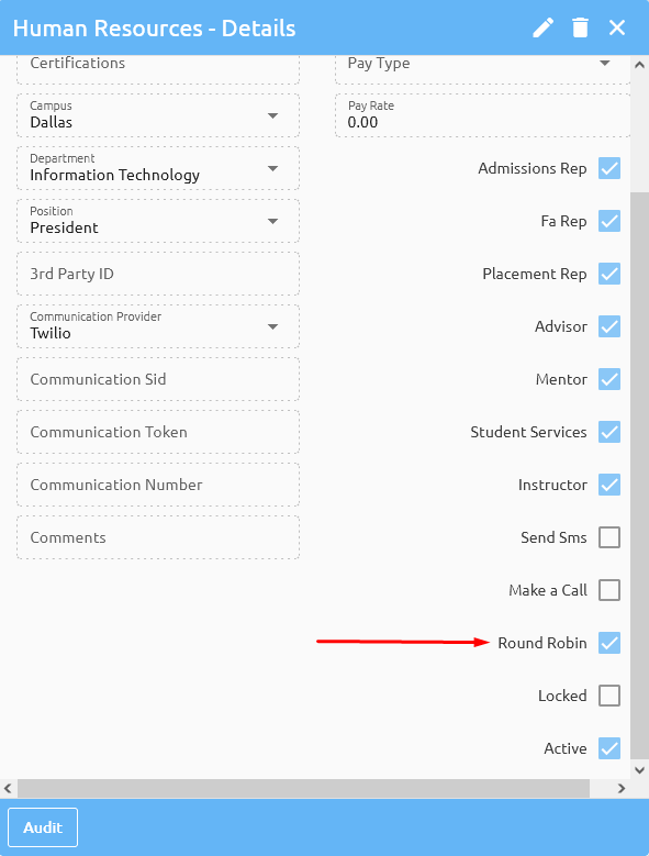 Check the Round Robin box for each Admissions Rep you want to include in the rotation.