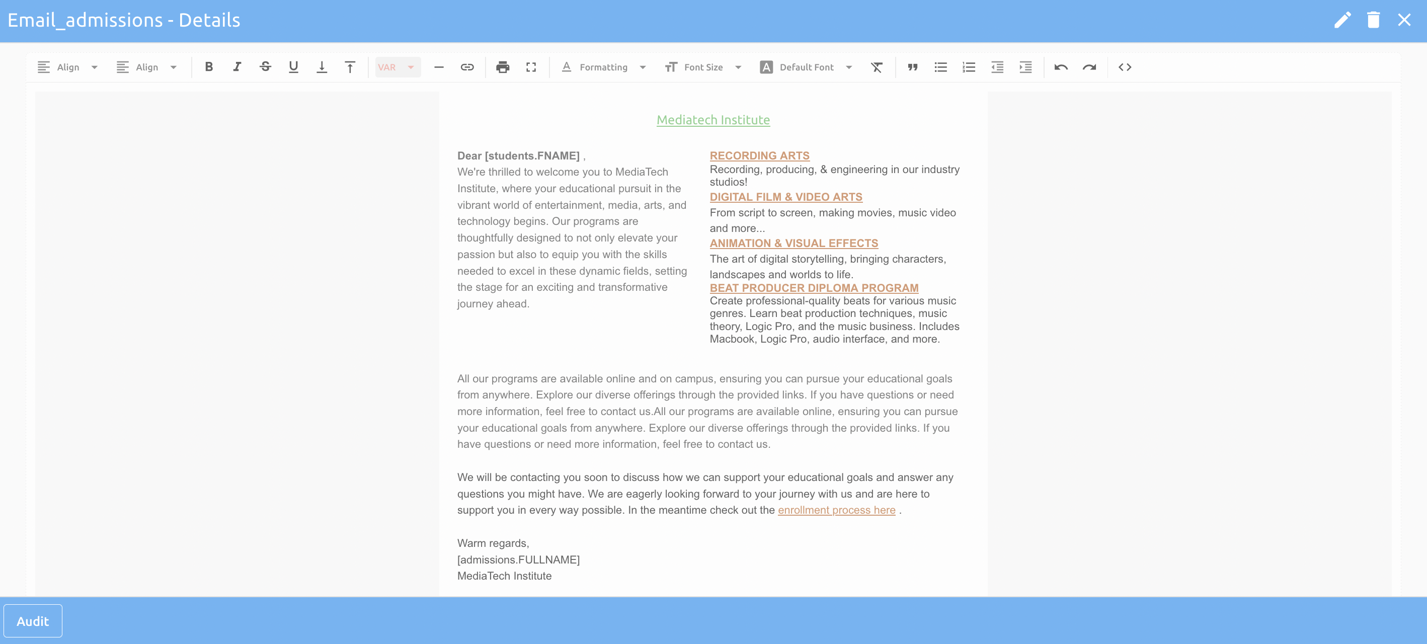 This section covers important email templates every educational institution should have configured. These templates include admission-related messages such as welcome emails, password resets, student portal notifications, and explanations for checkboxes.