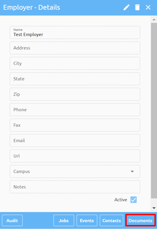 Employeers can be added under Placement -> Setup -> Employers. Additionally, to each Employer Jobs/Events, Contacts, and Documents can be added and attached.