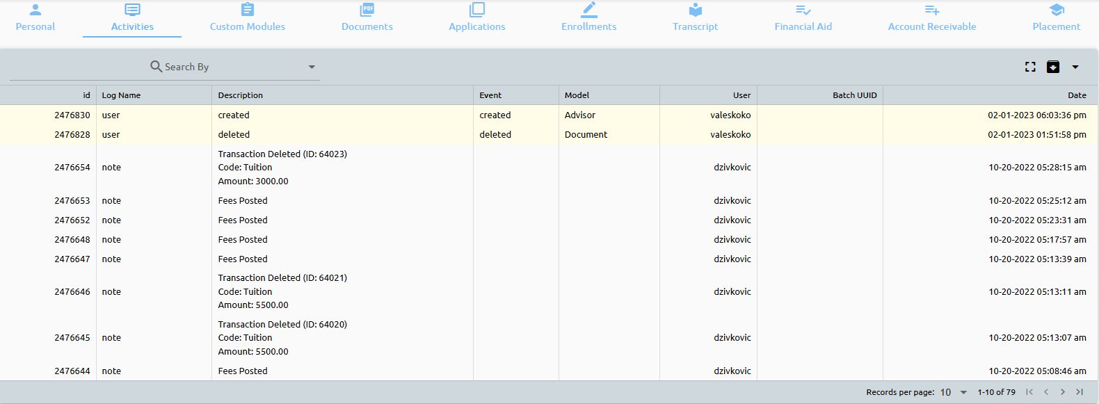 The Activities tab provides a full audit trail of actions taken on a student's record β including what was done, by whom, and when.