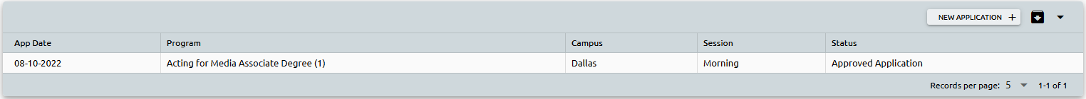 This is a quick view of where the student stands. The evaluation of a student and how they progressed can be seen here. New Application in the top right corner is where you can enroll your student.