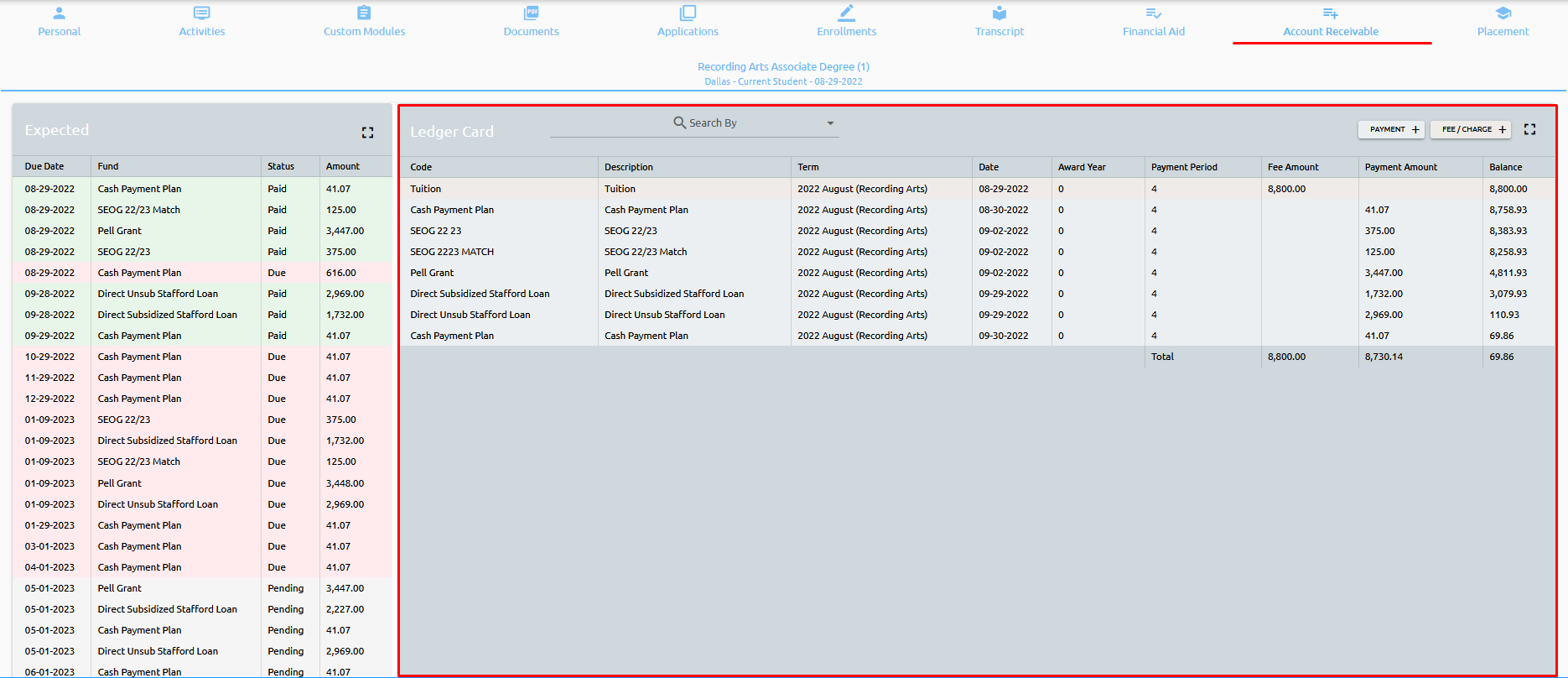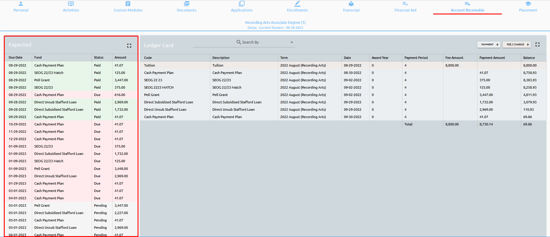 The Account Receivable tab provides a clear, real-time view of each studentβs financial standing β including financial aid, payment plans, and direct charges.