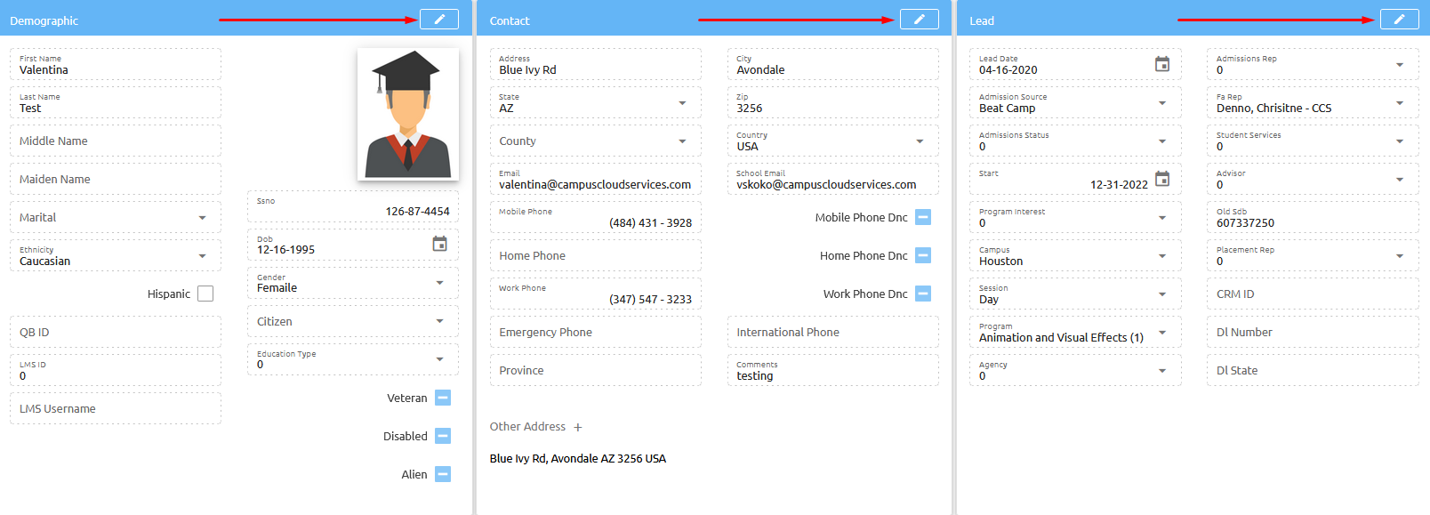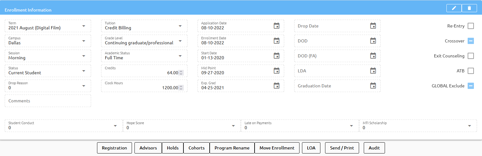 The Enrollments tab provides a comprehensive view of a student's program information β including start dates, expected graduation, and enrollment-specific actions.