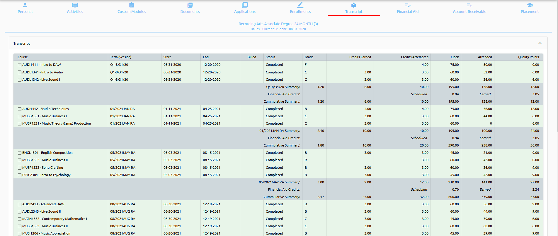 The Transcript tab provides a comprehensive inventory of the courses a student has taken or needs to take towards their degree. Additionally, it captures the grades they have received and attendance records for each course.
